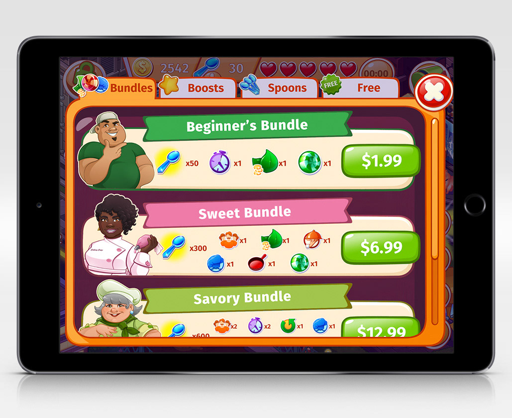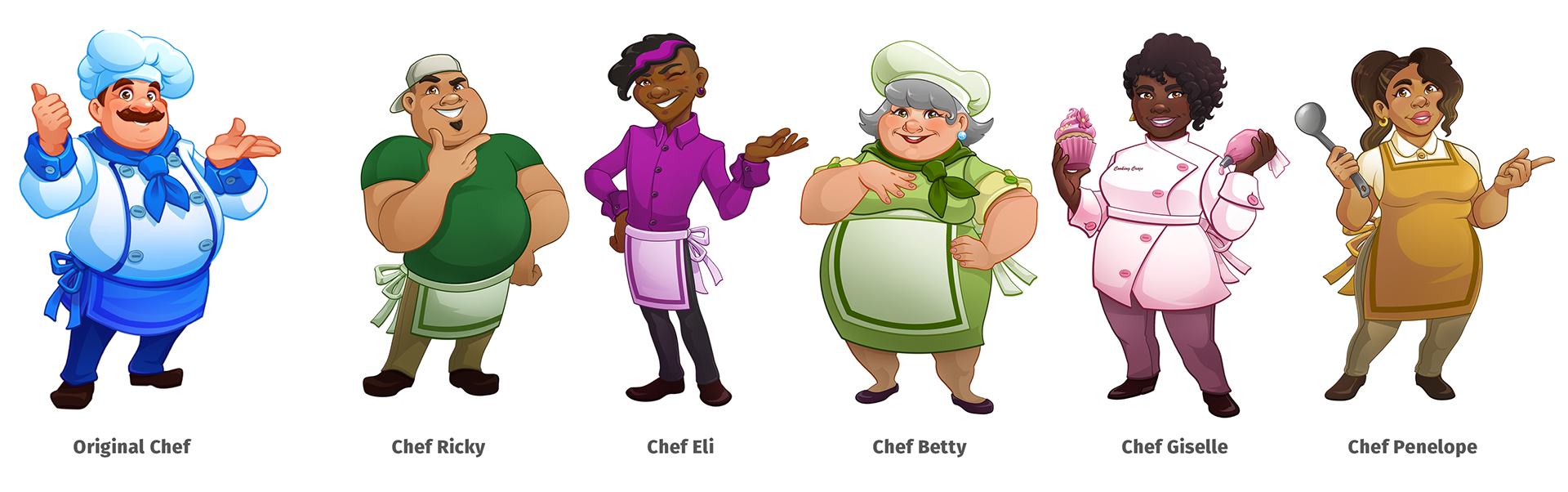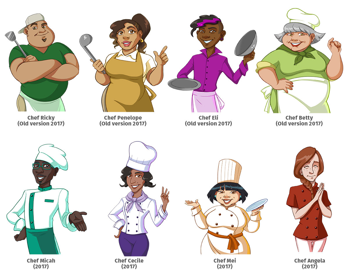 When Cooking Craze changed developers from Elefun Games to Matryoshka Games, the art style was redesigned. I decided to update some of the chef designs that were currently being used in the bundles section of the store using the new art style (old designs can be viewed below) Shown above are the updated versions, that I style-matched to the current look and feel of the game.