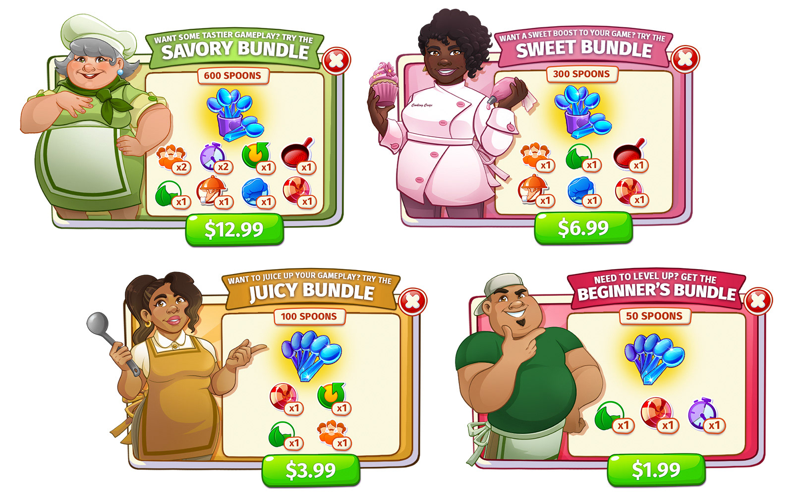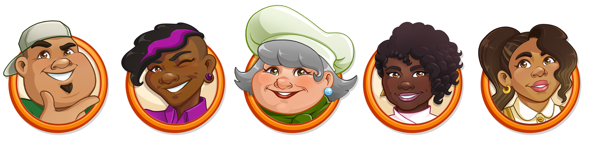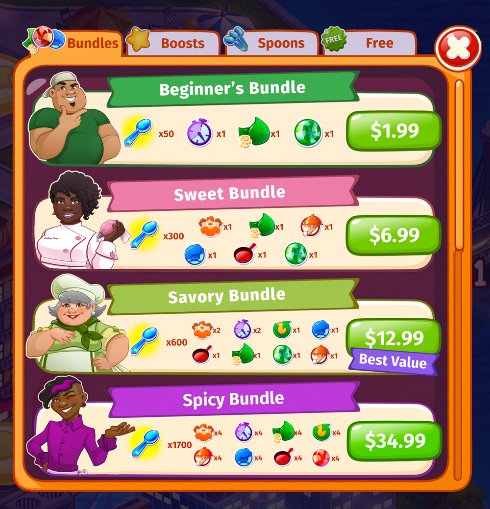 When Cooking Craze changed developers from Elefun Games to Matryoshka Games, the art style was redesigned. I decided to update some of the chef designs that were currently being used in the bundles section of the store using the new art style (old designs can be viewed below) Shown above are the updated versions, that I style-matched to the current look and feel of the game.