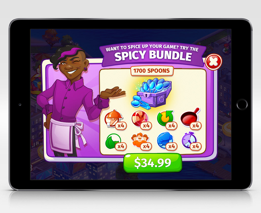 I also designed pop-up interstitials as a way to drive more purchases in the game. Since the chefs were mainly visible in the store window, I wanted to bring them out from "behind the counter" and utilize them in in-game marketing as a way to sell more in-game items by connecting to the player with characters. These interstitials were also a part of my passion project done outside of my day-to-day responsibilities.
