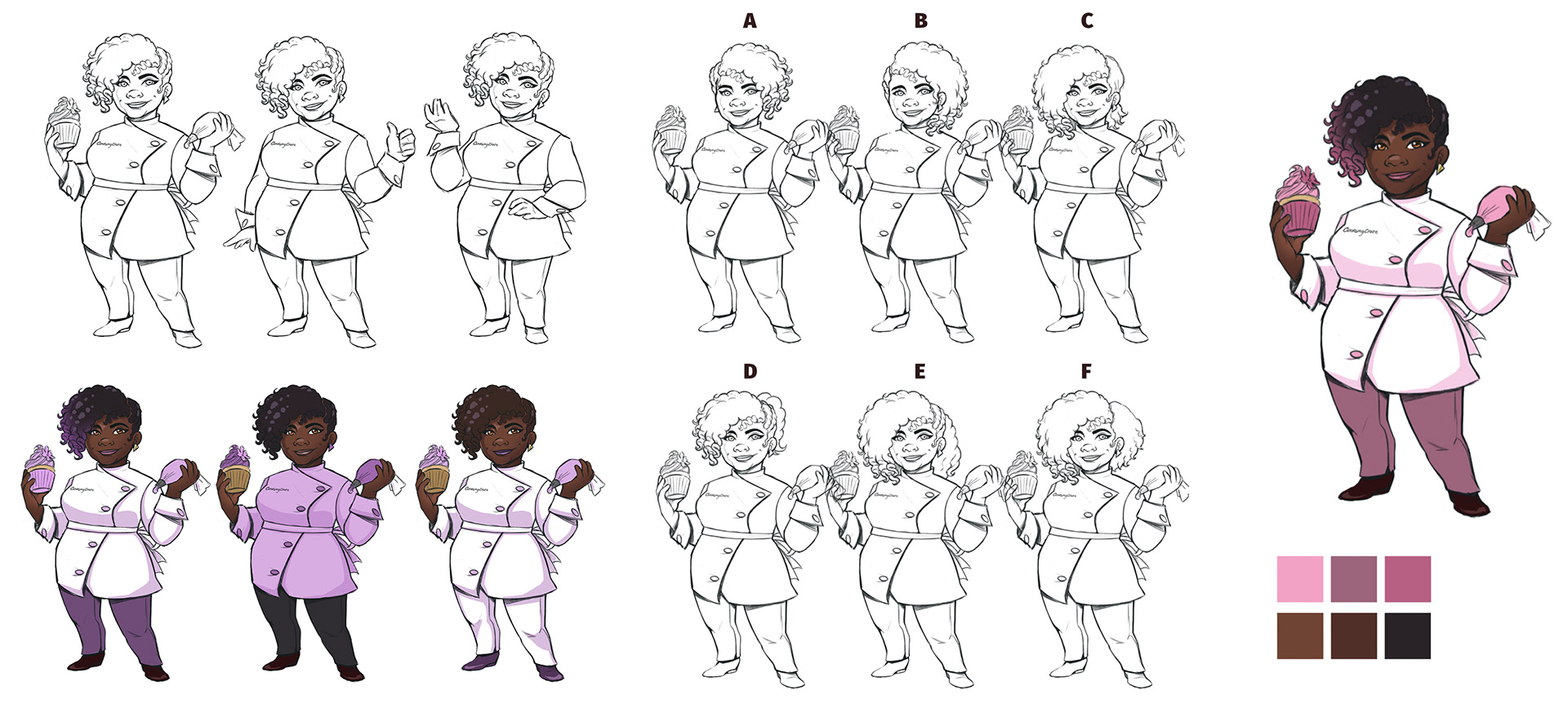 Below are a few process sketches that show design choices, hairstyle options, color palette options and poses. In the end, the client chose to keep most of the initial design choices, but we worked out different hair styles and landed on a rosy color palette.