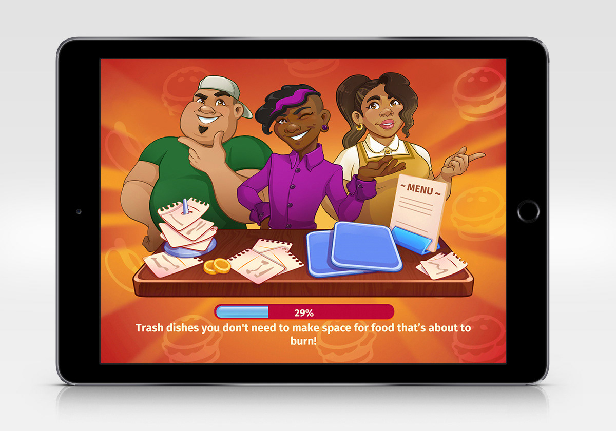 I designed 8+ characters, though not all were used in the game. Initially, a few of the chefs were used for loading screens, marketing, Food Truck and Food Court events, and in the game's store window.
