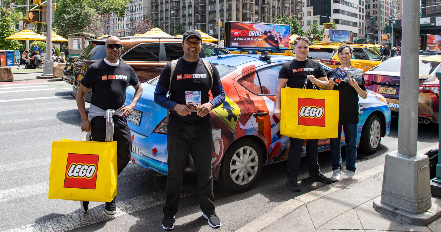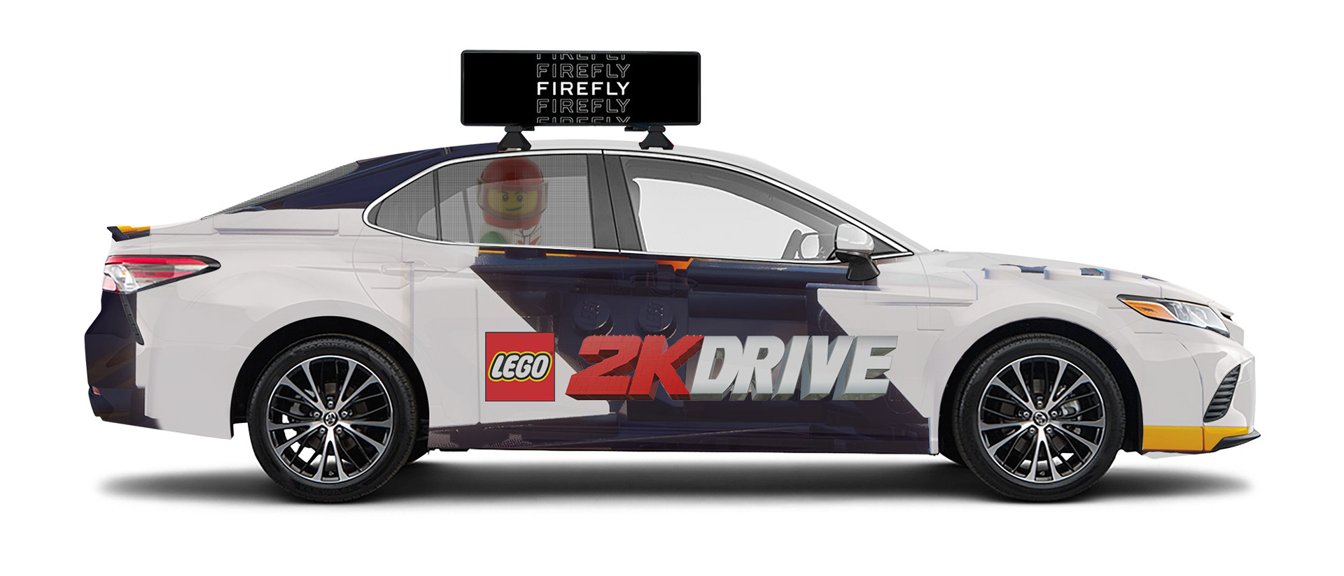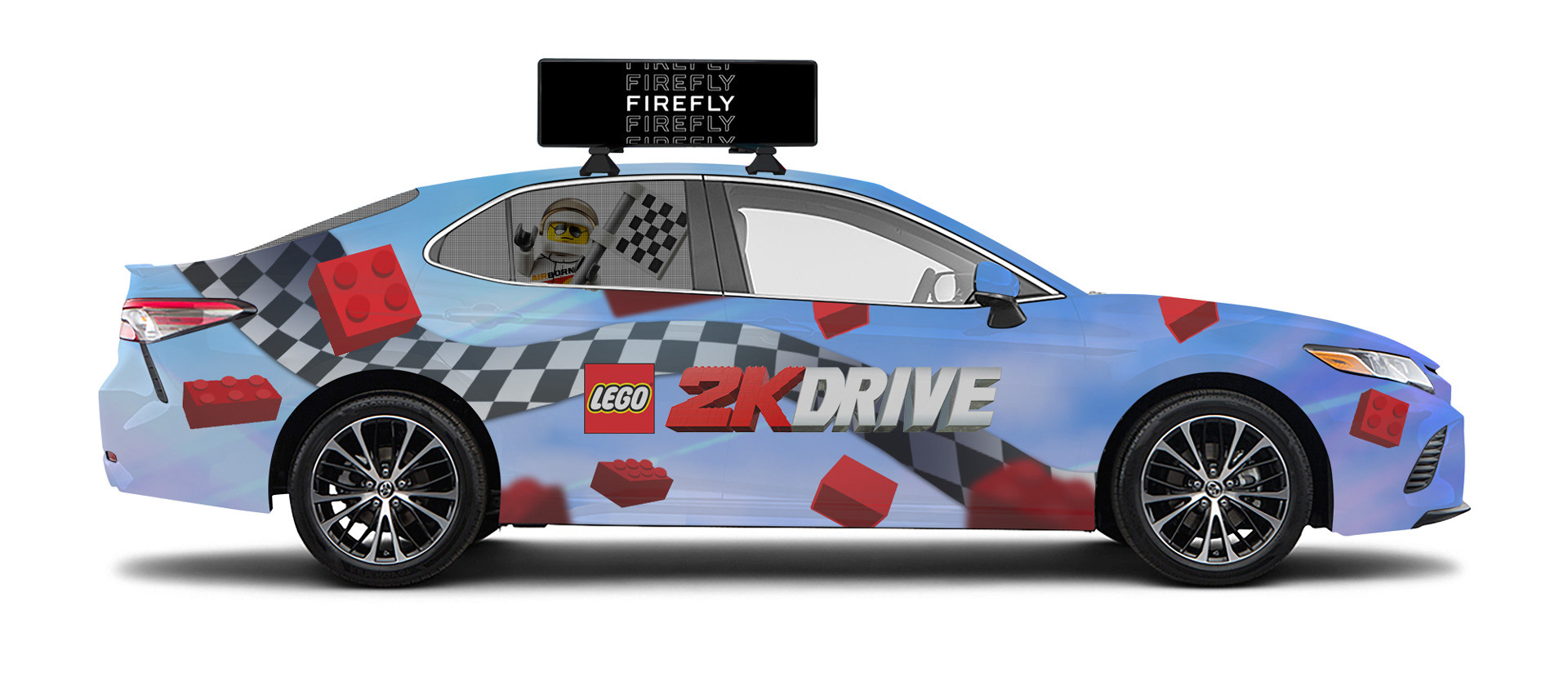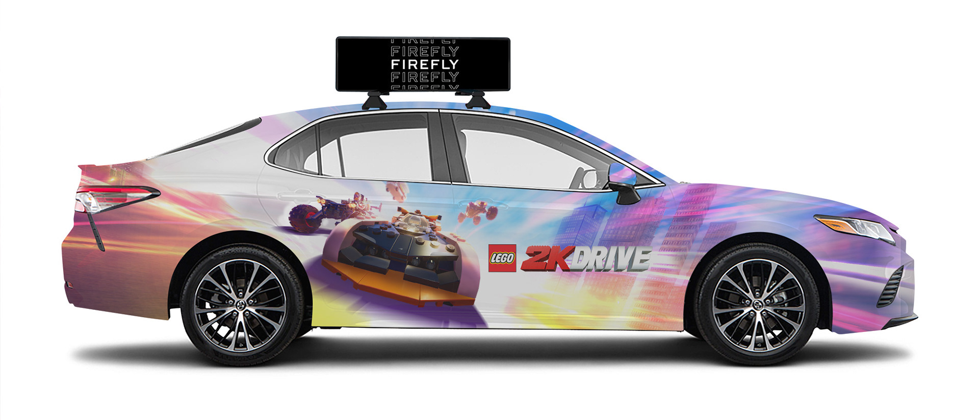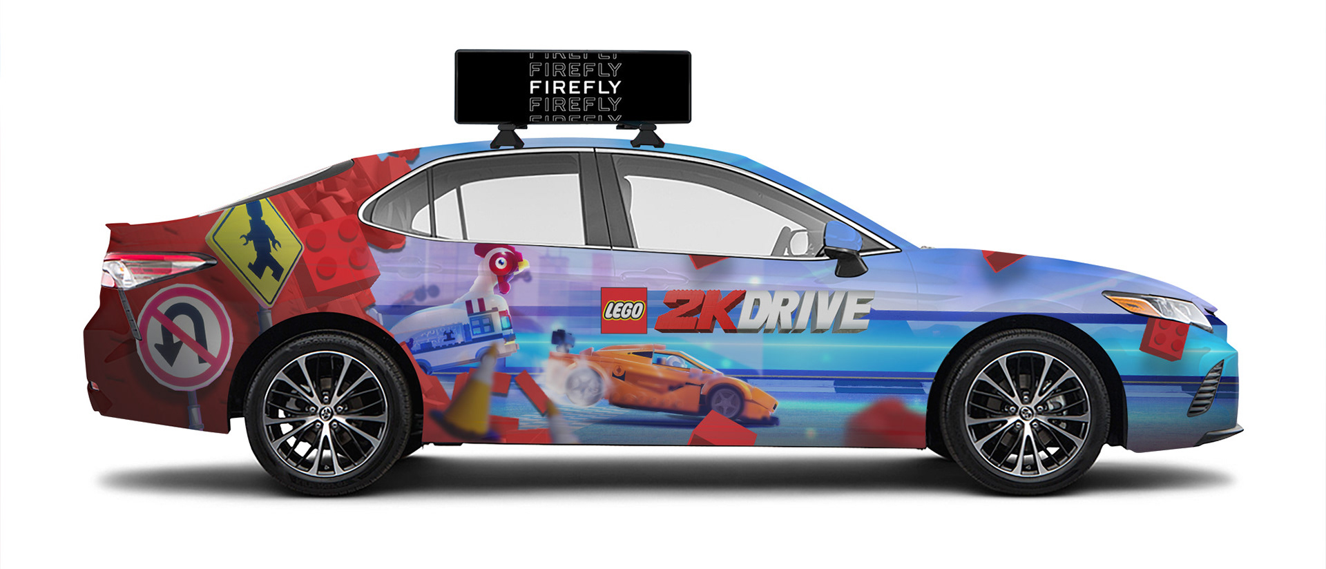 I worked closely with the Firefly Vehicle Advertisement company to create fun and eye-catching designs that would work on their vehicles and advertise the LEGO 2K Drive brand. I used a combination of illustration, 3D assets, and elements from our key art and in-game models to create 5 printed vehicle wraps. Two of the designs were composited and resized/ painted over versions of two of the in-game cars.