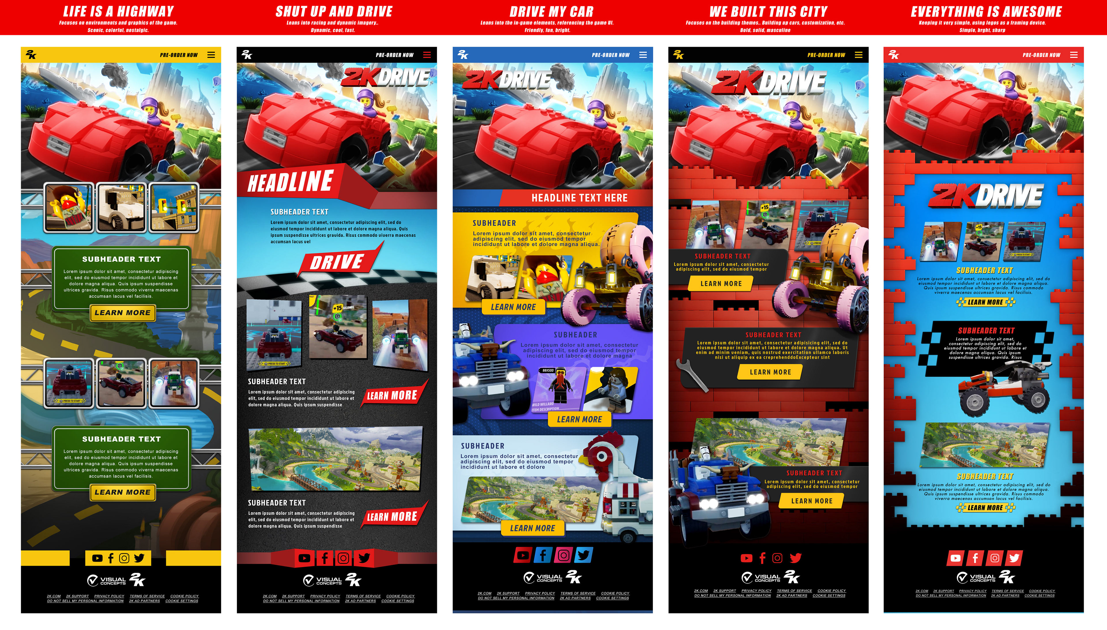 While at 2K Games, one of the projects I was able to work on was developing the look and feel of the marketing for 2K's first family game, LEGO 2K Drive. It needed to be fun and humorous, dynamic, colorful, and fit within the LEGO brand rules.