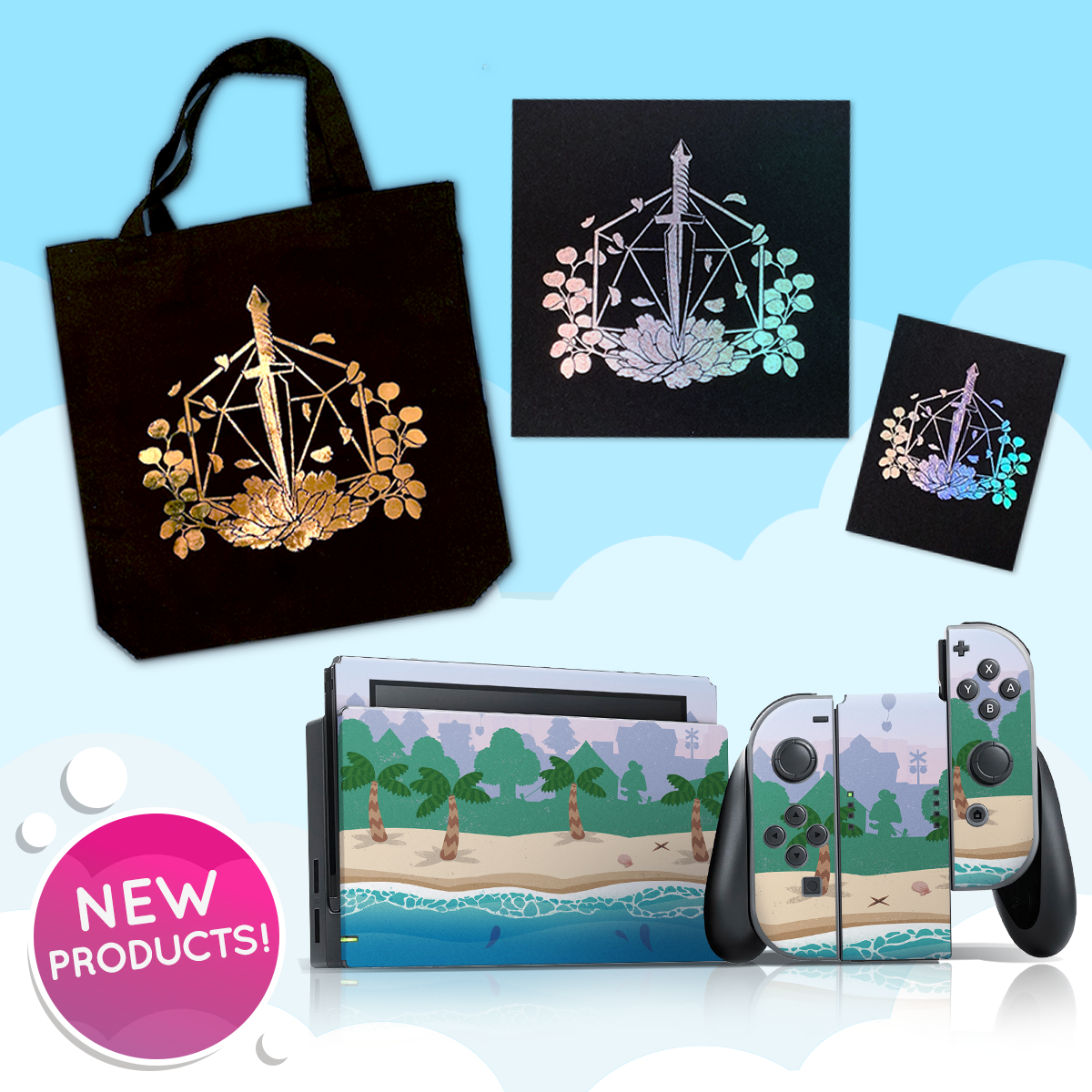 Here is an example of images for our Emerald City Comic Con announcement post, meant for our social channels. I wanted to find a way to feature our new print designs as well as completely new products such as bags, sticker sheets, and device skins while staying within a limited space for social posts.