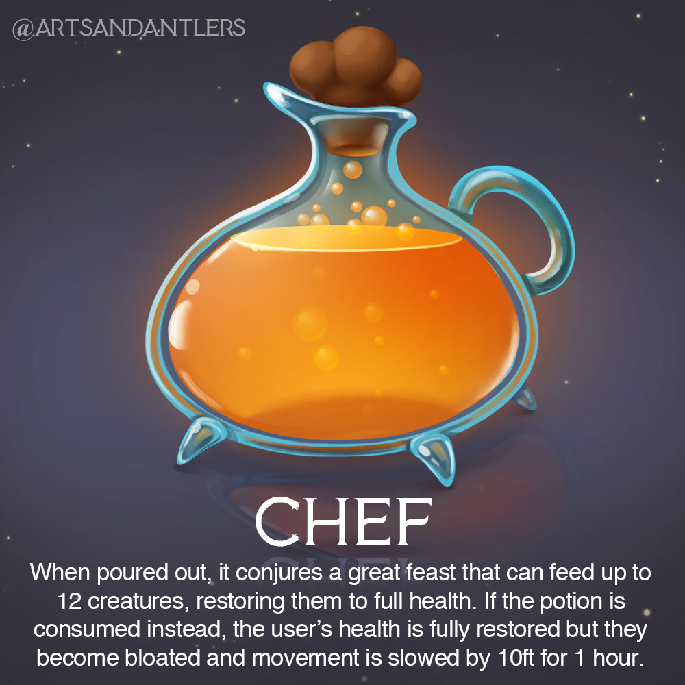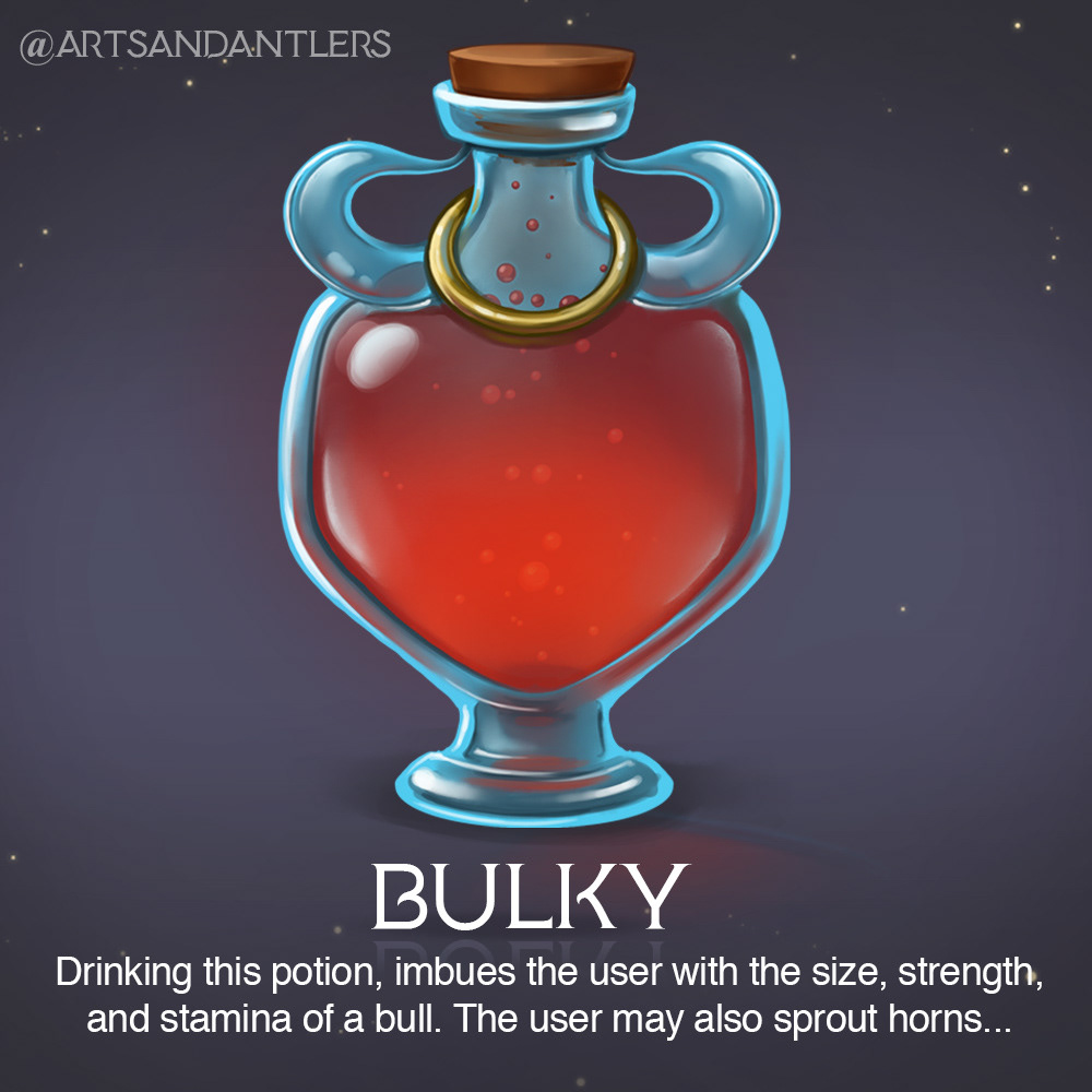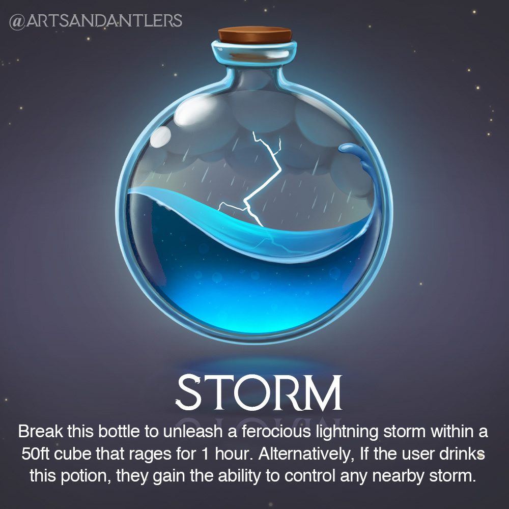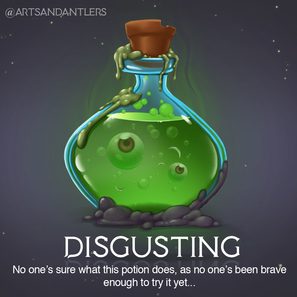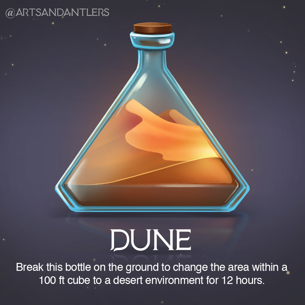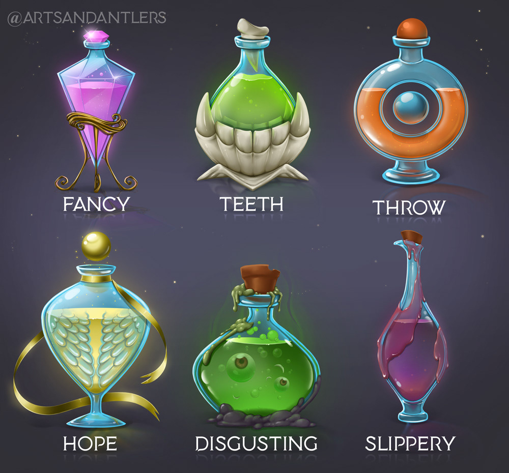 For each design, I also came up with ideas for what the potions did, based around the Dungeons & Dragons 5th Edition rules and mechanics. The finished product is meant to provide content to be used as "Homebrew" items in D&D games.