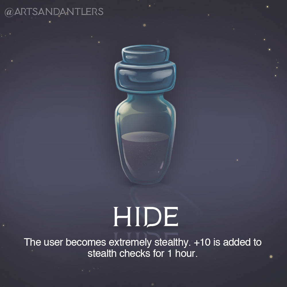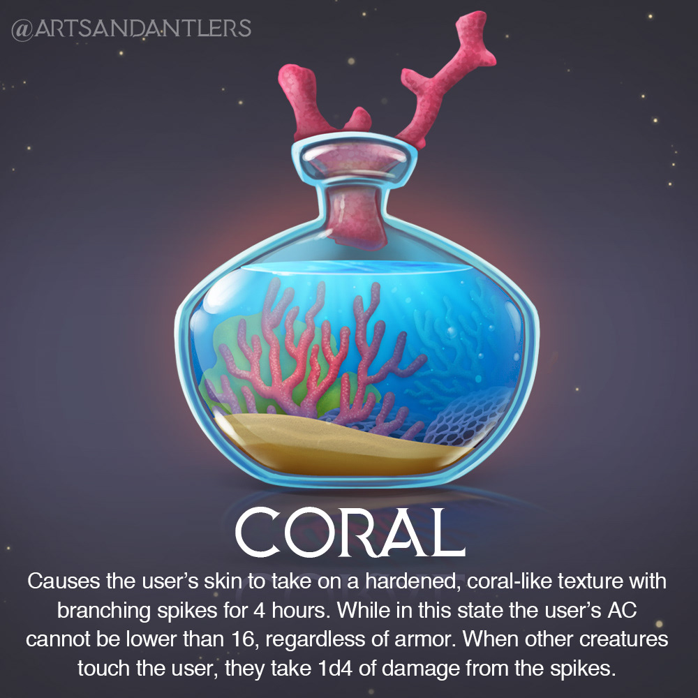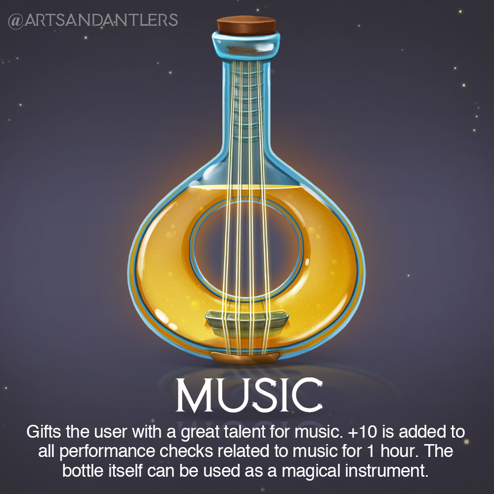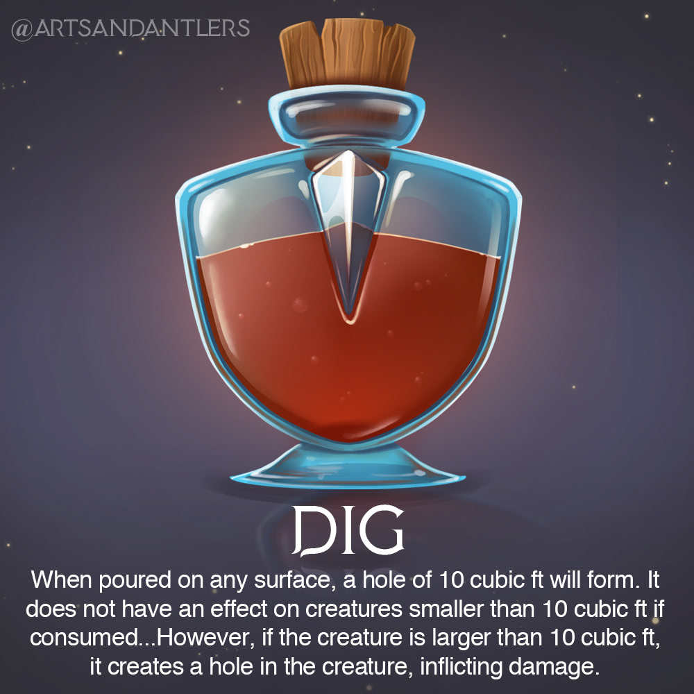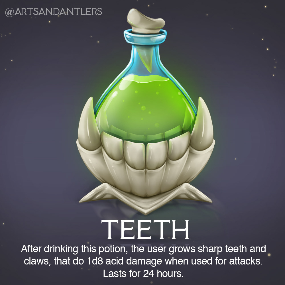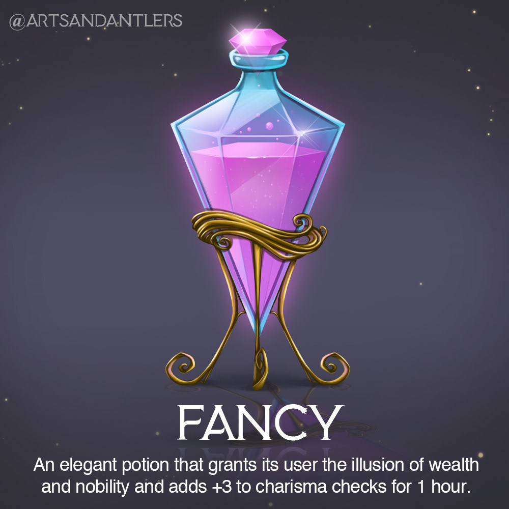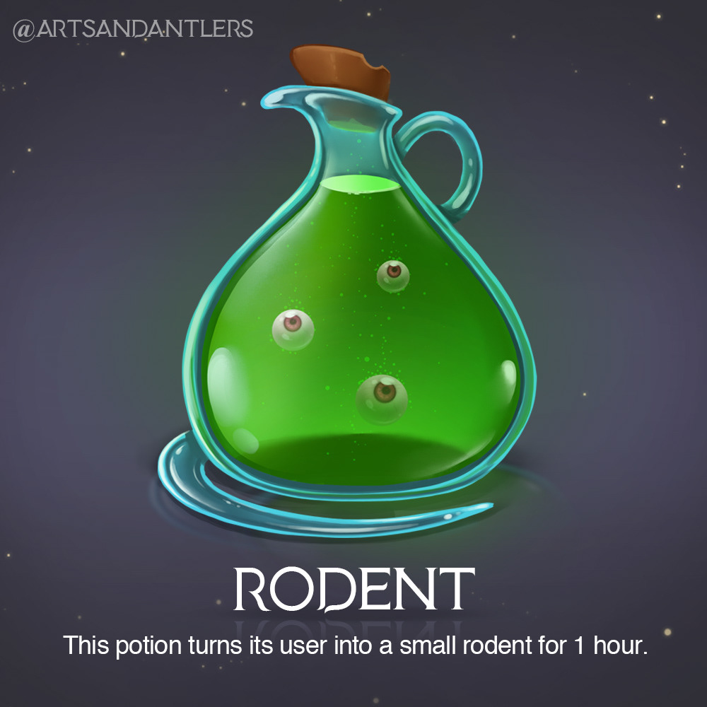 For each design, I also came up with ideas for what the potions did, based around the Dungeons & Dragons 5th Edition rules and mechanics. The finished product is meant to provide content to be used as "Homebrew" items in D&D games.