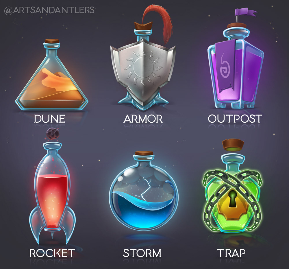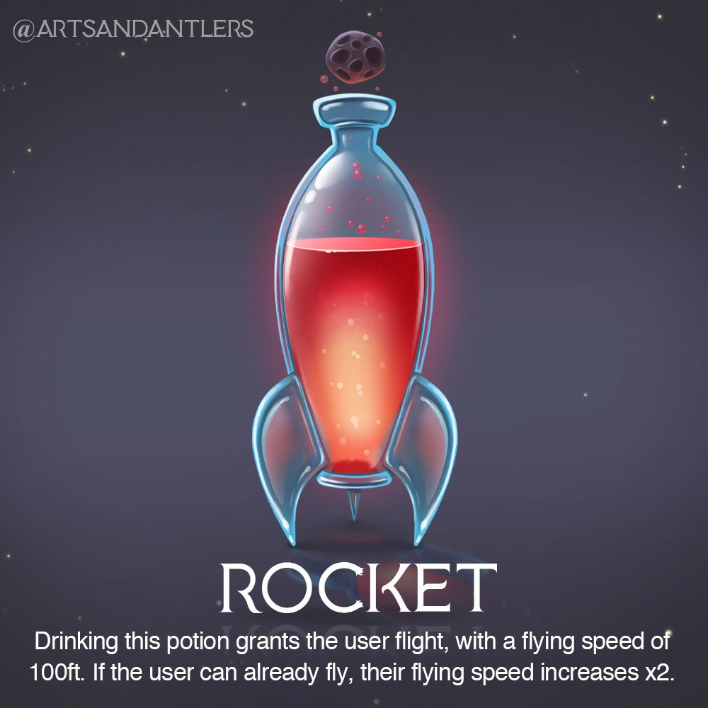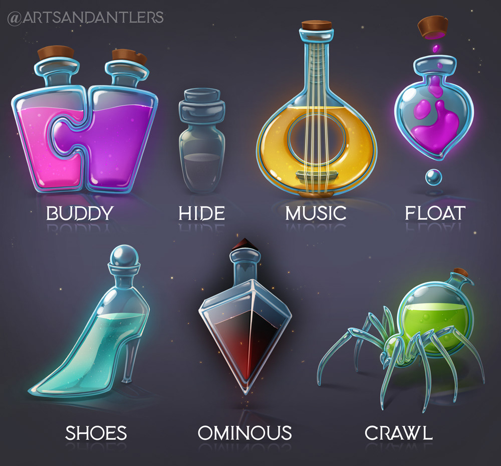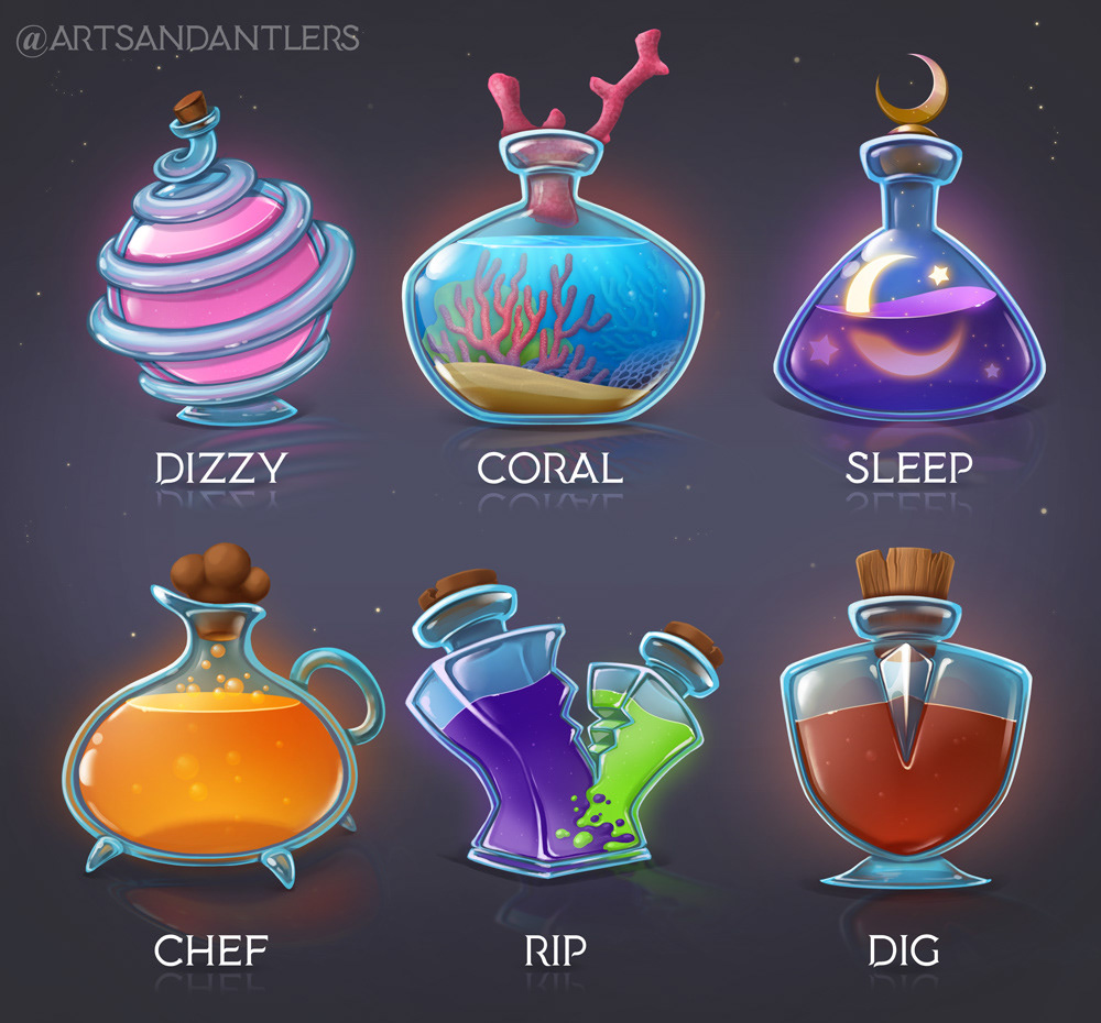 I created this personal project as a way to explore and improve my skills in concept art, design, and digital painting. The project is based on the Inktober 2020 challenge, but with my own twist. Instead of doing an ink drawing a day, as the Inktober challenge calls for, I created magical potion designs based on each of the prompts on the Inktober Official 2020 Prompt List and did digital paintings for each design.