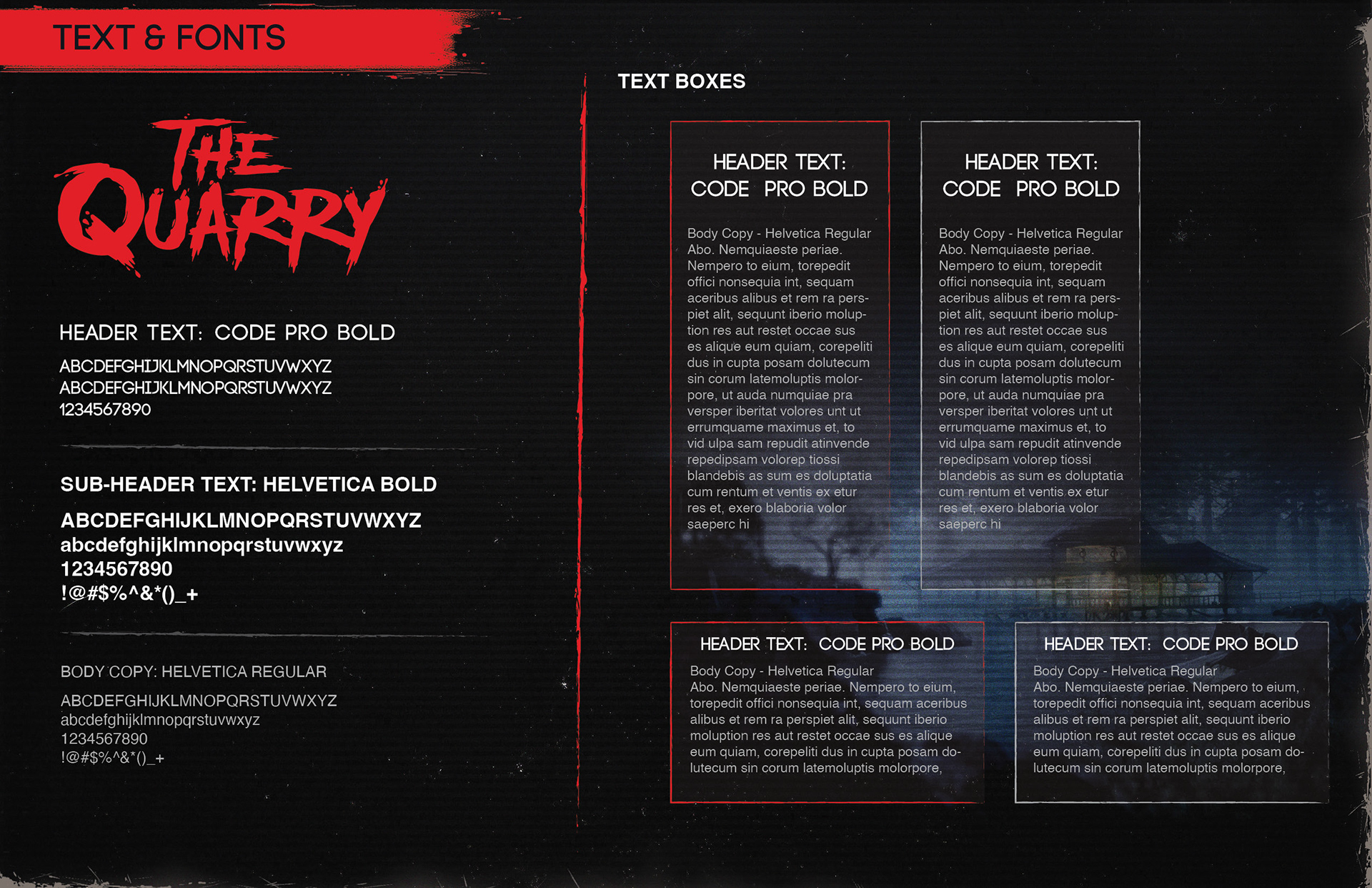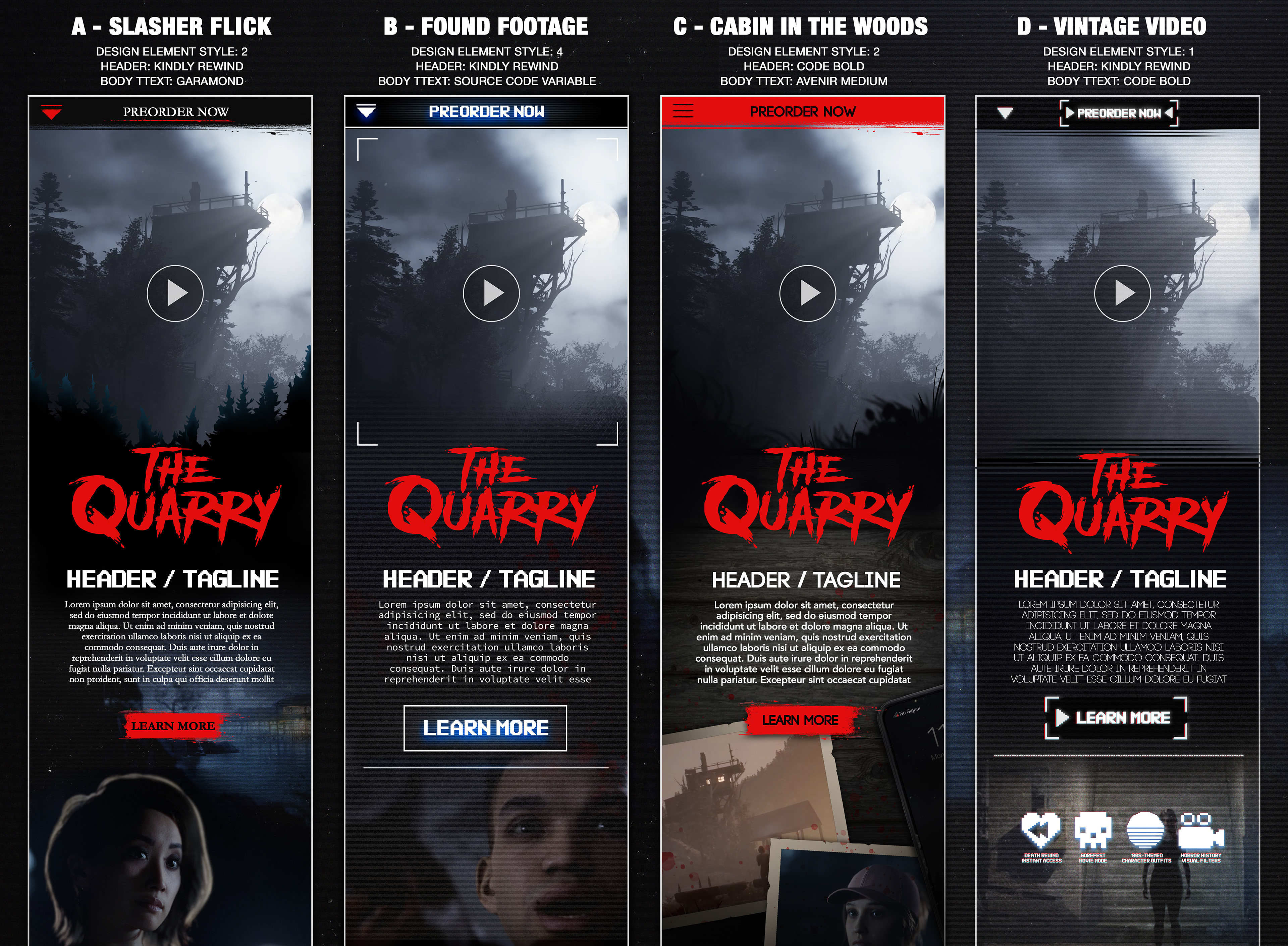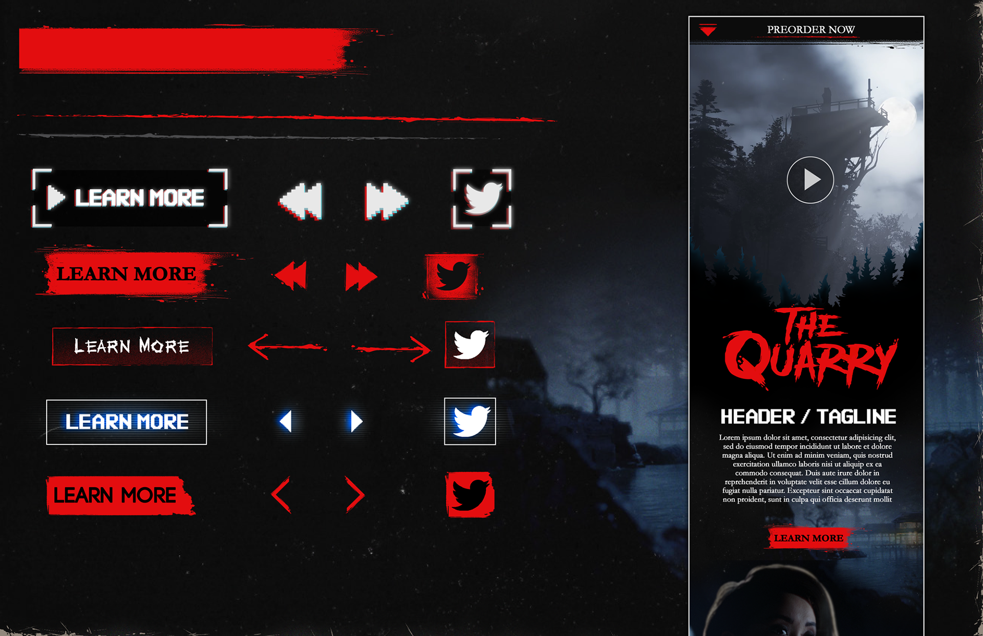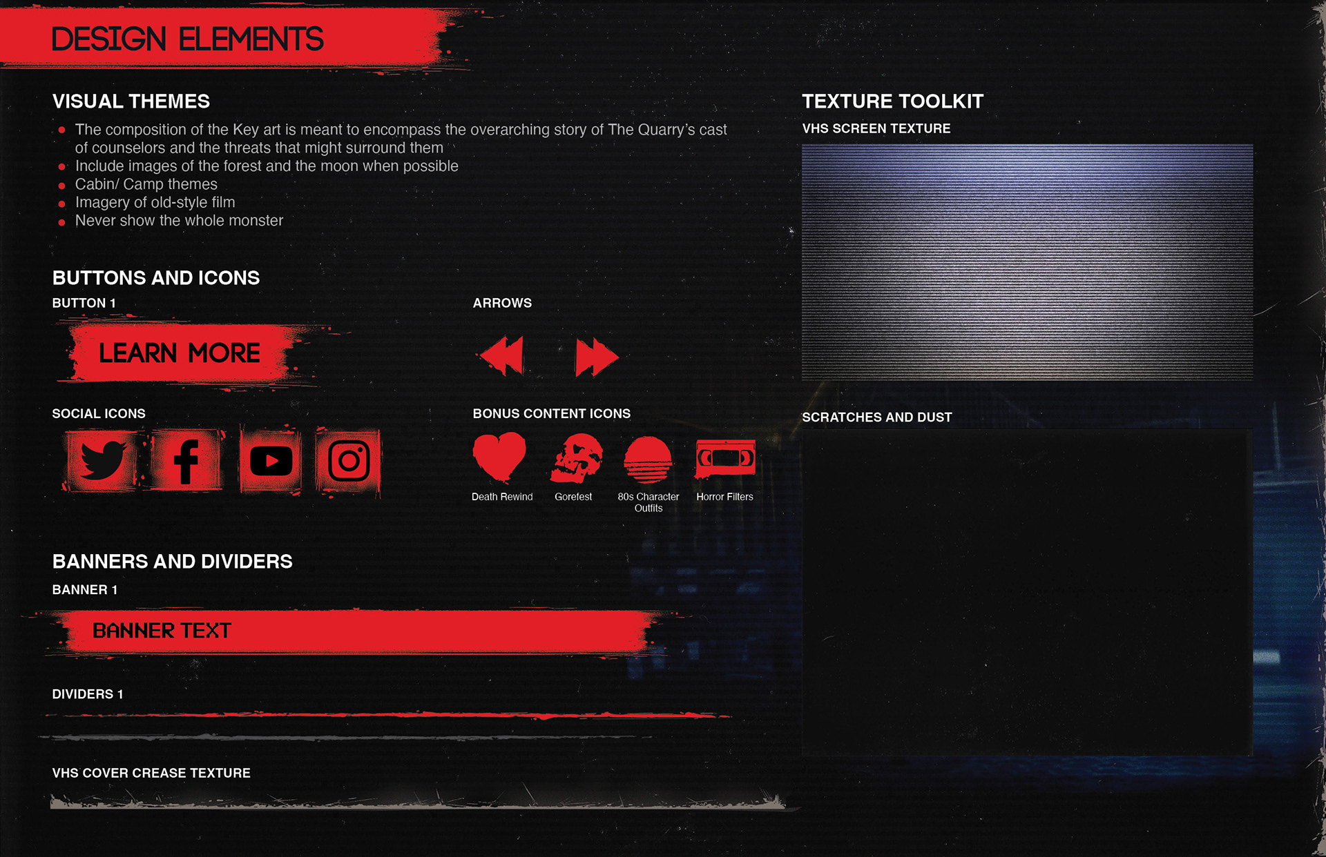 I researched the styles of 80s slasher classics, along with some modern revivals of the style like Stranger Things and used the provided key art as a launching point for creating design elements to accomplish the desired look and feel and build a full style guide document. I used a combination of design and illustrative elements to create things like buttons and banners, dividers, text containers, icons, textures, and more.