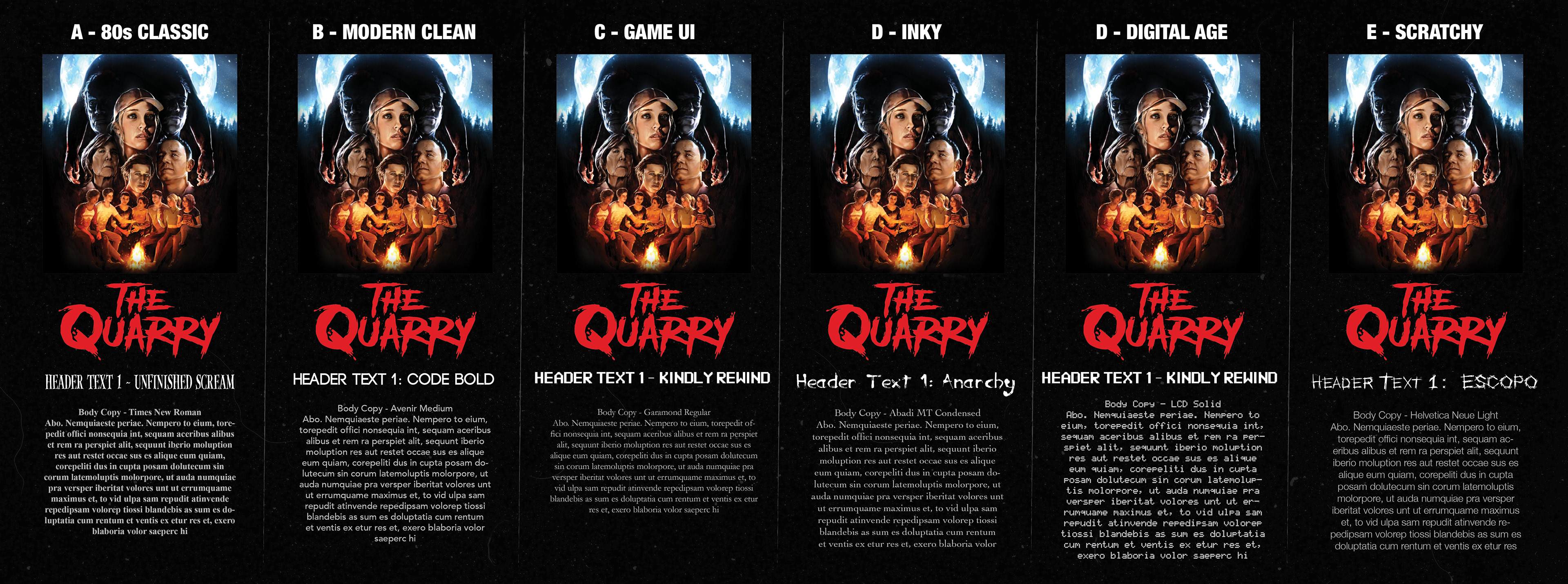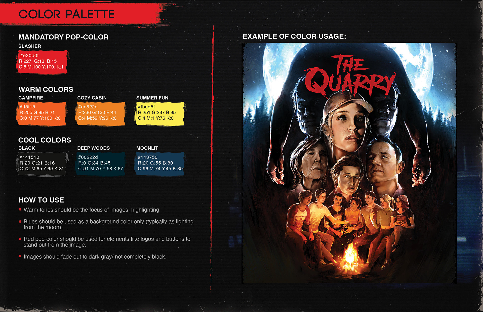 I was asked by 2K Games to help determine the look and feel for Supermassive Games' The Quarry marketing. Though the game is set in the current time, it makes use of many classic horror movie tropes. The marketing team wanted to take advantage of this and use a classic 80s slasher look for the marketing, relying on illustrative qualities, texture, dark atmosphere, and high contrast.